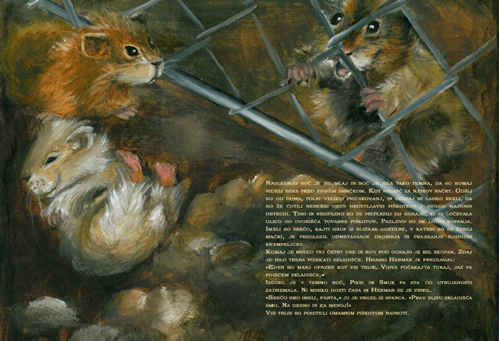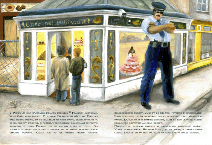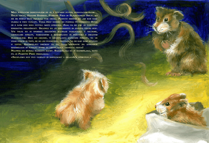 Neverjetno zabavna zgodbica o treh neugnanih hrčkih, ki se odločijo, da bodo vlomili v Chez petit biscuit, najbolj znano pekarno piškotov v Parizu. Da ne bo pomote, vonjave, ki se širijo okoli pekarne, so tako čudovite, da so morali pred vhod postaviti varnostnika, kajti med številnimi kupci in radovedneži, ki so se zbirali zunaj, bi se prav lahko našel kdo, ki bi ga zamikalo ukrasti katero od slastnih sestavin ali celo recept. Hudobni Hugo, vodja varnostnikov, je veljal za strah in trepet vseh vlomilcev in ostalih nepridipravov, kajti mnogi od njih so se ravno po njegovi zaslugi znašli za zapahi. So naši trije junaki vendarle dovolj prebrisani, da se bodo brezplačno posladkali z dobrotami, ki se skrivajo za zidovi pekarne?