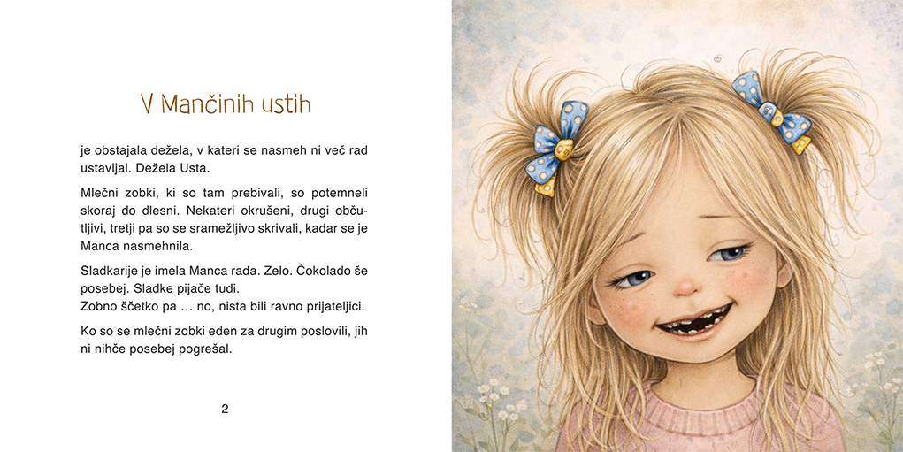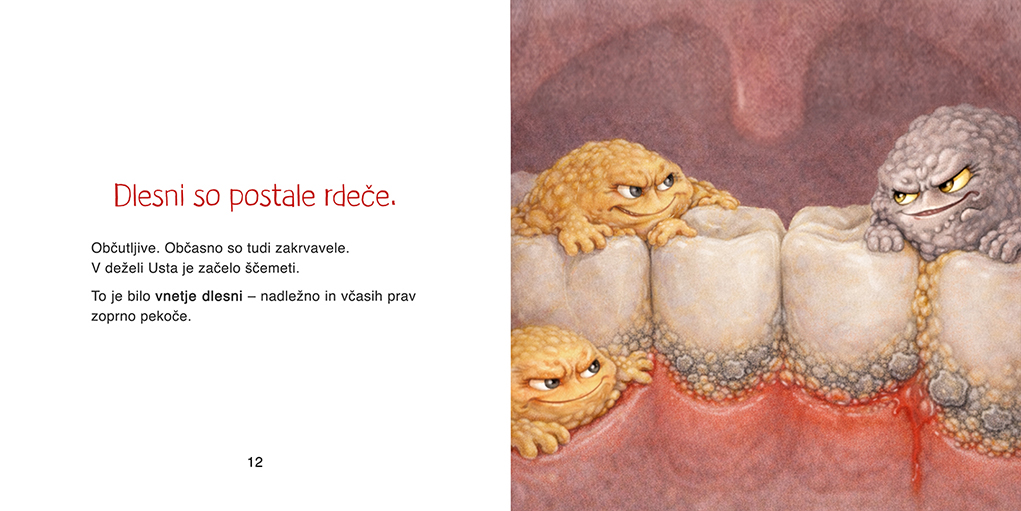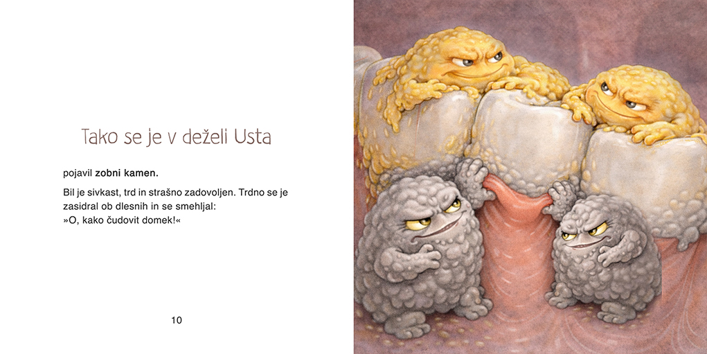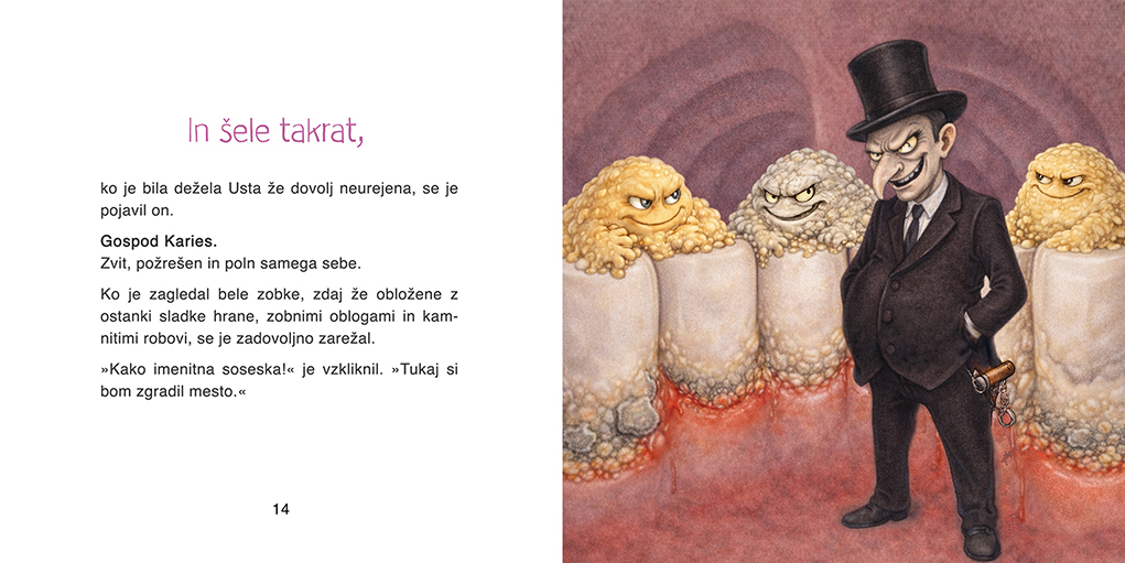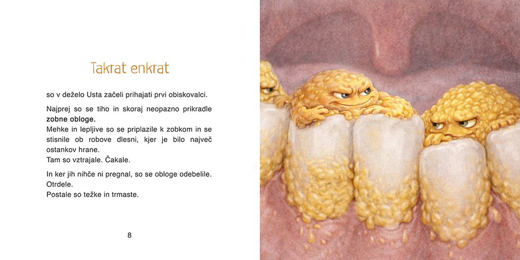 Takrat so se prikradle zobne obloge. Sprva čisto neopazno. Mehke, lepljive in vztrajne. Za njimi je prišel še zobni kamen – sivkast, trd in zelo zadovoljen sam s seboj. In ko je v deželi Usta zavladal pravi kaos, se je pojavil še on: gospod Karies. V klobuku, z nasmeškom in velikimi načrti.