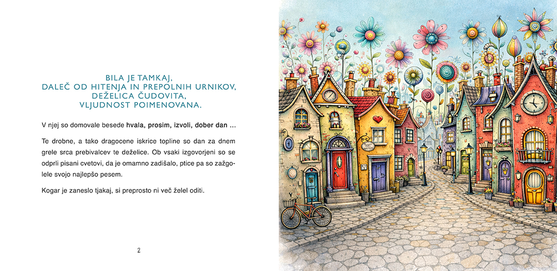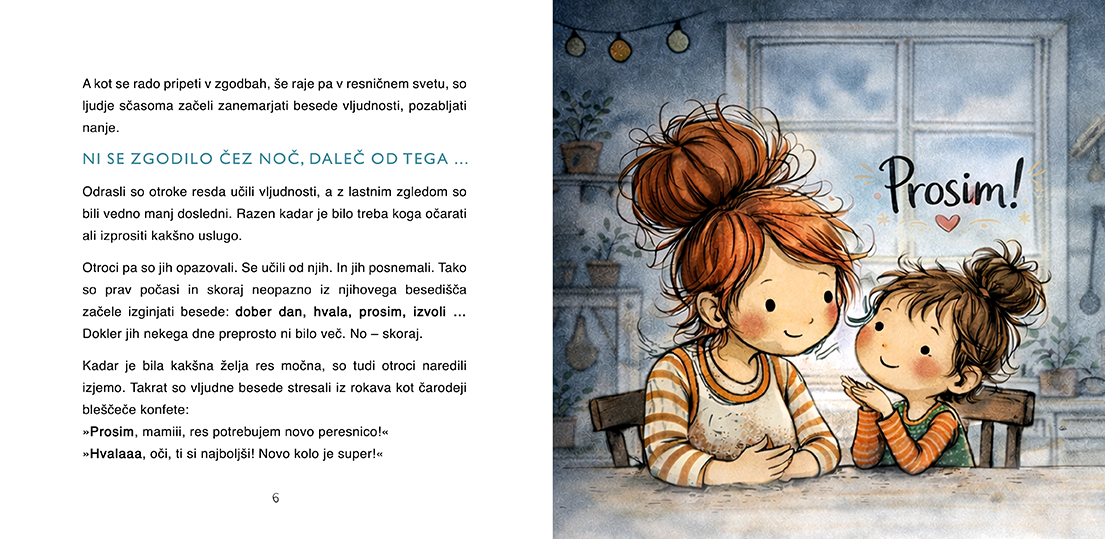 Nežna slikanica o besedah, ki svet delajo prijaznejši. V deželi Vljudnost skozi pravljično zgodbo pokaže, kako lahko preproste besede – prosim, hvala, izvoli – znova prižgejo toplino med ljudmi.