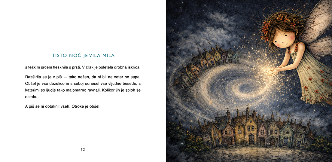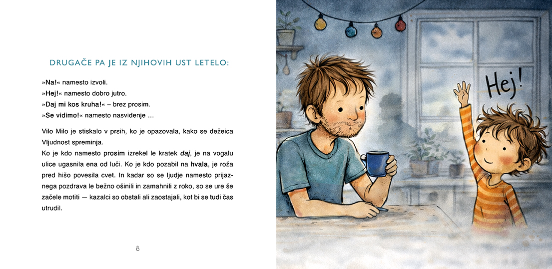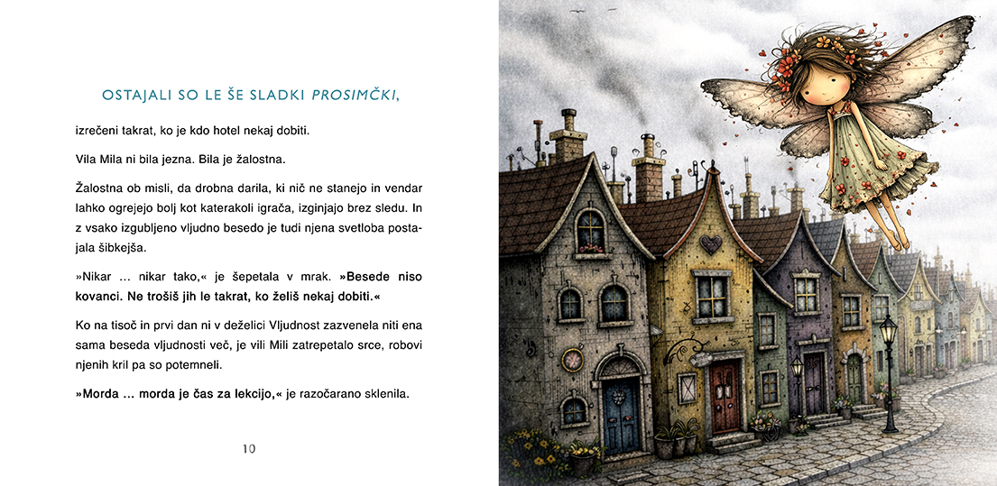 V deželi, kjer domujejo vljudne besede, vila Mila še vedno skrbi, da iskra prijaznosti ne ugasne. Ko ljudje nehajo pozdravljati, se zahvaljevati in prositi, se svet začne tišati in temniti. A vsaka izrečena prijazna beseda ima moč, da spremeni razpoloženje, odnose – in celo celotno deželo.