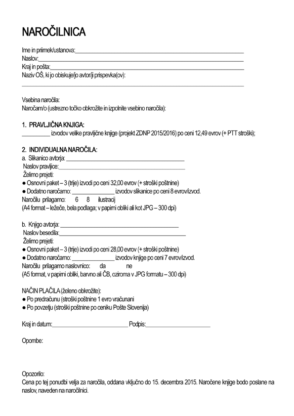 Naslovnica knjige: lahko jo posreduje tudi avtor (na papirju ali po e-pošti v JPEG formatu 300 dpi), vendar ob naročilu oziroma najkasneje do 15. decembra 2015, sicer bo izdelana pri nas.